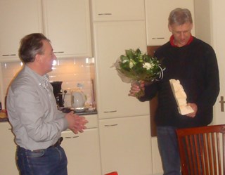 Gisteravond heeft John Berkhout afscheid genomen als voorzitter van de Jeugdcommissie. Wegens drukke werkzaamheden moet John noodgedwongen stoppen. Dinto voorzitter Bobbes de Ruyter was aanwezig om zoals hij het noemde, het boegbeeld van Dinto, in het zonnetje te zetten. Hij prees John voor zijn vele activiteiten binnen de vereniging. Maar, zo zei John in zijn dankwoord: ”Jullie zijn voorlopig niet van mij af ” Hij blijft nog lekker volleyballen in het team van heren 4 en ook vanaf de tribune zal hij zijn volleyballende kids aanmoedigen. Dus zullen we hem nog vaak in de sporthal zien. Als zijn opvolger werd Peter Jongejan verwelkomd, die vanaf nu de zware taak van voorzitter op zich gaat nemen.