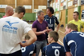Net als bij de vrouwen nam ook bij de mannenhoofdmacht een icoon van Dinto afscheid. Spelverdeler Sander van den Berg hangt de schoenen aan de wilgen. “Volgend seizoen wil ik nog wel blijven trainen. Er is een kleintje op komst en ik wil daardoor de zaterdagen vrij hebben.” Van den Berg is altijd multifunctioneel geweest. Zo speelde hij op de diagonaal, buitenkant, middenblokkering en dus de laatste jaren als spelverdeler. Een optreden in een lager team ziet hij vooralsnog niet zitten. “Ik hoop in de toekomst met wat meer oudgedienden in bijvoorbeeld in de regiodivisie te spelen. Maar voor komend jaar is het dus alleen door het weeks trainen, mits er plaats is in de selectie, want ik kan me goed voorstellen dat er ruimte wordt geboden aan aanstormend talent.” Van den Berg startte in de basis, maakte met zijn service direct het eerste punt, maar zag zijn team vervolgens flink achterkomen:8-15. Met een excellerende Jurgen van Baar poetste Dinto de achterstand volledig weg. Een kill-block van Rick van Broekhoven zorgde voor de eerste winst:27-25. Twee zeer zwakke sets (19-25 en 14-25) deden het ergste vrezen voor de thuisploeg. Verblaauw bracht George Nieuwland in de selectie en een opslagreeks van Wessel Blom bracht Dinto op een flinke voorsprong:10-2. Eenvoudig speelde de ploeg zich naar een beslissende set:25-13. Tot de veldwissel leek er door harde smashes van Charles Bos niets aan de hand:8-7. Door enkele knullige fouten liet Dinto de Amsterdammers echter alsnog ontsnappen:12-15.