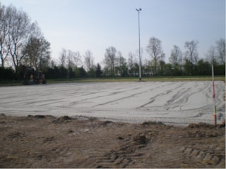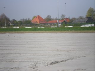 Het begint er al een beetje als een ”Beach” uit te zien. Het zand is aangebracht en vlak gemaakt, een enorme woestijn, goed voor zes velden.