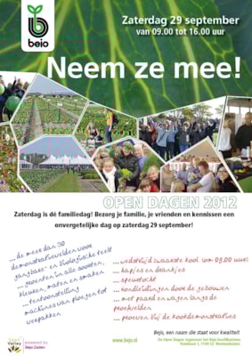 Zijn de eerste dagen bedoelt voor ”mensen uit het vak” op zaterdag is iedereen van harte welkom op dé familiedag. Dus wil je graag een kijkje nemen bij dit werelwijd toonaangevende bedrijf kom tussen 9.00 en 16.00 uur naar de Trambaan in Warmenhuizen. www.bejo.nl (http://www.bejo.nl)