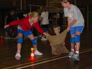 trekken (een op een jutezak en twee anderen zo snel mogelijk de zak langs een parcours van pionnen met tennisballen zigzaggen). Vervolgens blind volleyballen (het net werd afgeschermd met lakens) deken volleyballen (met
