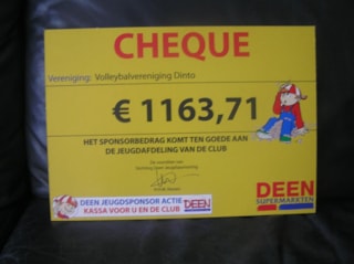 Deze munten worden omgezet in een geldbedrag waarmee Dinto nieuwe spullen kan aanschaffen of een leuke dag kan organiseren voor de jeugd. Tot onze grote verassing hadden wij de meeste munten weten te scoren in Warmenhuizen en daarom mochten wij een cheque in ontvangst nemen van € 1163,71. !!!!!