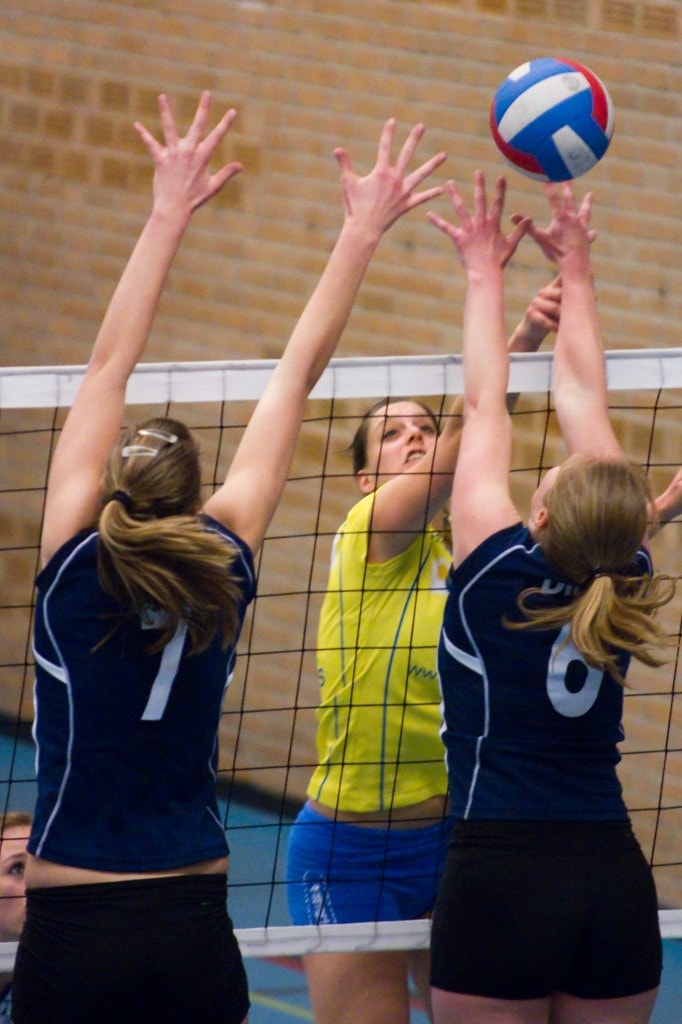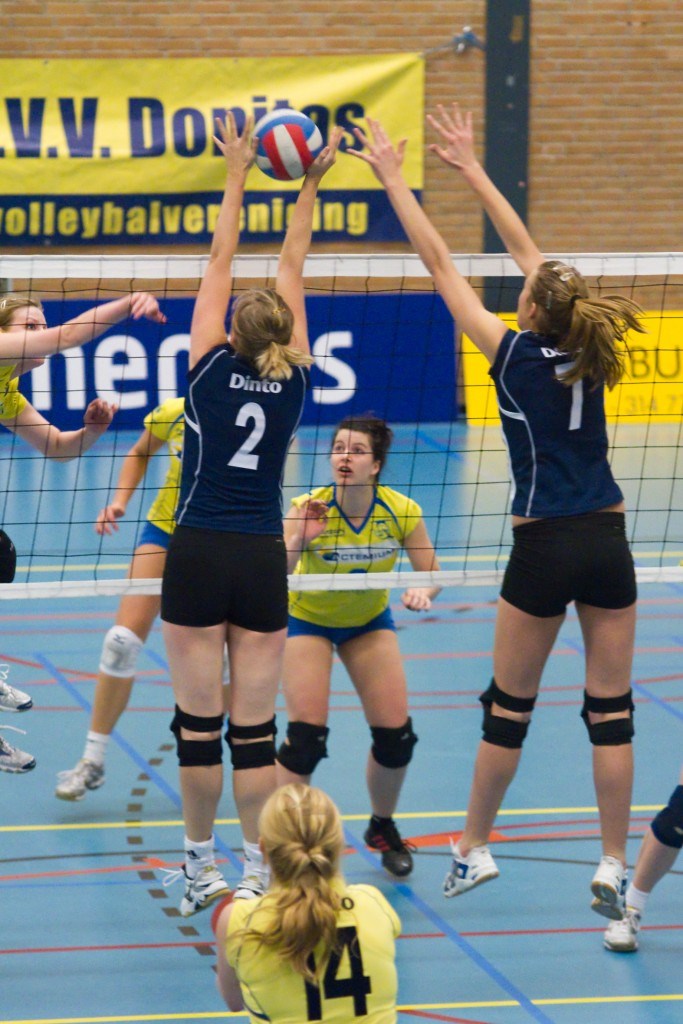 • Inge en Misha blokkeren een bal van Donitas  foto: Frank Roossink