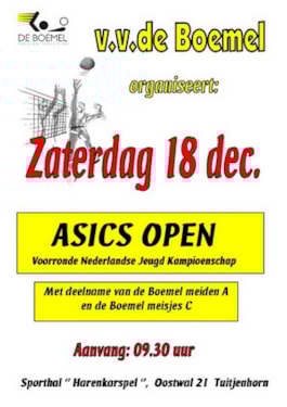 Zaterdag 18 december zijn de voorrondes van de Nederlandse Jeugd clubkampioenschappen. Ook dit keer worden de voorrondes van de Asics Open o.a. in Tuitjenhorn gespeeld. Volleybal vereniging De Boemel organiseert het voor de 3e keer en De Boemel meiden A en meisjes C mogen in hun thuishal spelen.