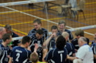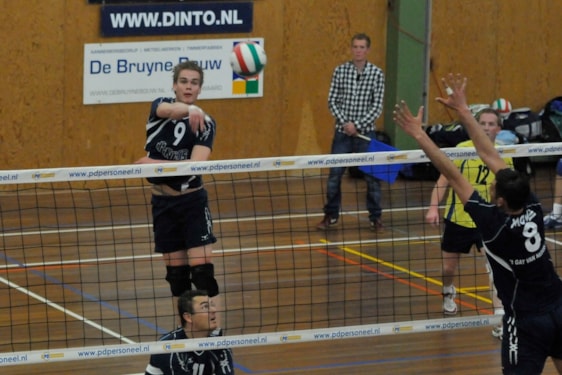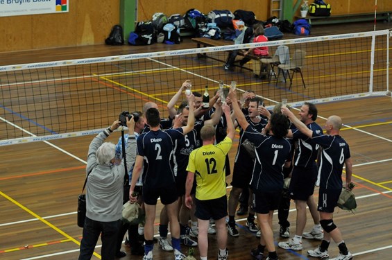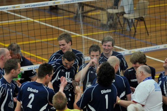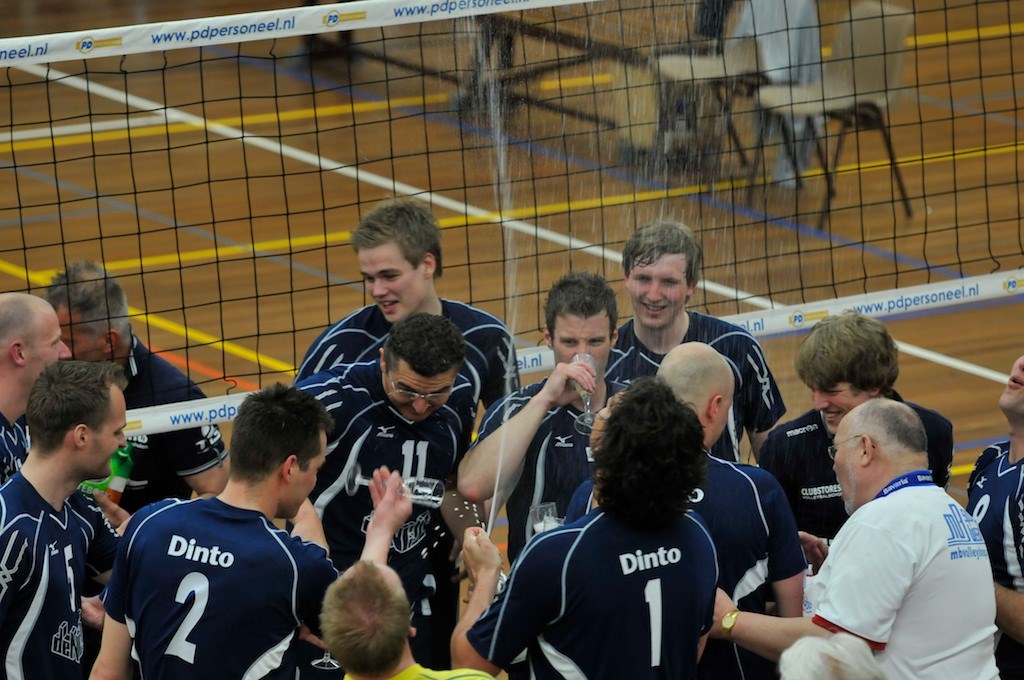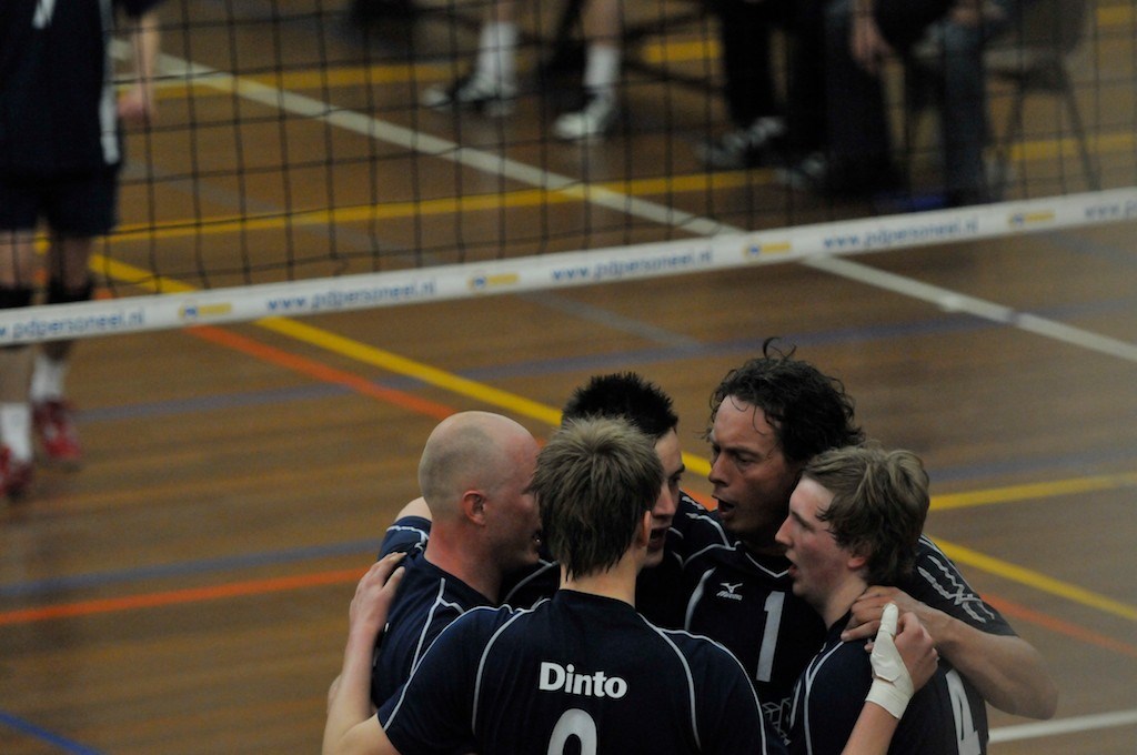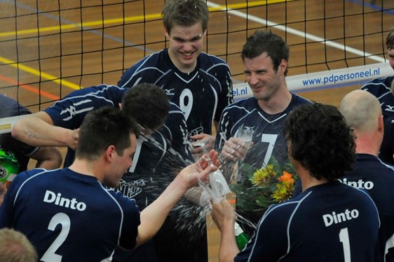 Charles Bos ontpopte zich als man van de wedstrijd. De 38-jarige diagonaalspeler, die zijn volleybalcarrière met het kampioenschap in stijl afsloot, was als koele afmaker van onschatbaar belang. “Een mooier afscheid kun je je niet wensen. Ik heb echt heerlijk gespeeld. Ik kreeg panklare set-ups van Olaf Buter en die kon door de goddelijke passing van Erik Mulder de blokkering van Move perfect uit elkaar trekken.” Ook Geco Verblaauw kon met een behaalde titel op gepaste wijze afscheid nemen. “Echt een goed gevoel. Ze waren superscherp en dat was ook wel nodig, want Move heeft werkelijk alles in het werk gesteld om van ons te winnen. Ik vond, zonder iemand te kort te doen, Erik Slagter van uitzonderlijke klasse. Door de blessure van Neal Blom moest hij vrijwel voor het eerst dit seizoen een hele wedstrijd opdraven. En dan nog wel in zo’n belangrijke wedstrijd. Maar het hele team heeft eigenlijk top gepresteerd.” Dinto startte in de wetenschap dat door de winst van concurrent Huizen op Harambee alleen een 4-0 overwinning de titel zou opleveren. Toch was er geen spanning waar te nemen. De sporthal De Doorbraak was afgeladen vol en zorgde voor een prima ambiance voor een topwedstrijd. Door de sprongservice van Rick van Broekhoven sloeg de thuisploeg een gaatje:12-9. Olaf Buter legde een prima tempo in de spelverdeling en Joost van den Berg kon veel via de flanken scoren. Met 25-17 was de eerste toon gezet. Dinto had moeite met de taaie verdediging van de Volendammers en bij een 18-18 stand was de spanning in de sporthal voelbaar. Een kill-block, gevolgd door een ace van Wessel Blom zette Dinto op het goede spoor. Met een vlekkeloze side-out stond vrij snel een 25-21 stand op de borden. Charles Bos begon steeds meer zijn stempel op het duel te drukken. Erik Mulder pakte schier onmogelijke ballen van de grond en Olaf Buter koos terecht voor Bos als afmaker in de rally. Ook de centrumaanval van Rick van Broekhoven en Erik Slagter was vanuit de servicepass ongenaakbaar. Een prachtige rechtdoorgeslagen beuk van Joost van den Berg zette via 25-22 een 3-0 setstand op het bord. Nu ging het erom ook het laatste deel te verzilveren. Bij een 18-15 voorsprong durfde voorzitter de ceremonie in werking te zetten. De bloemen werden klaargezet, maar Move leek zich bij een 22-17 stand gevaarlijk op te richten. Bij een 23-20 stand scoorde van den Berg fraai via de handen. Volendam haalde nog eenmaal de opslag terug. Dinto had nog één score nodig voor het kampioenschap. Deze belangrijke set-up bewaarde Olaf Buter voor Charles Bos. Met een snoeiharde driemeteraanvaller was de routinier de gevierde man in Warmenhuizen: 25-21. Het kampioenschap werd uitbundig gevierd en direct daarna kon het eindfeest van de vereniging in stijl losbarsten.