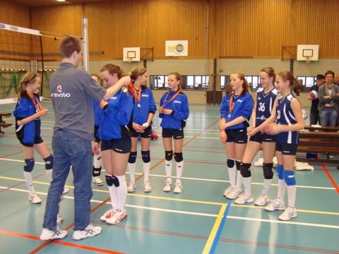 Tegen De Boemel kwamen de meiden maar moeilijk op gang. De service liep niet goed en ook in de verdediging lieten ze wat steken vallen. Desondanks werd de wedstrijd met 2-0 gewonnen (25-19-25-18). Vervolgens moest Dinto 3(!) uur wachten voordat de kraker tegen Move aanbrak. Move begon voortvarend en bij een 9-20 achterstand leek Dinto een pak slaag te krijgen, maar de knop ging opeens om. Rosa serveerde 10 punten op rij en daarna waren Amber en Lieke ook zeer succesvol met de opslag. Dinto pakte alles in de rally van de grond en met mooie blokkeeracties van Pernilla waren Warmenhuizer meiden alsnog spekkoper:25-22. In de tweede set kwam Dinto weer flink achter:1-8. Keihard knokken voor elke bal zorgde ervoor dat alsnog met 25-20 gewonnen werd. Dinto speelde daarna tegen Croonenburg en won gemakkelijk met 25-18 en 25-19. Ze waren hierdoor Kampioen van de Regio en kregen een enorme beker en medailles. Superknap van de meiden, zeker als je bedenkt dat ze nog maar 1e jaars C zijn. Nu volgt een nieuwe uitdaging…. Op zaterdag 2 juni spelen de meiden de finale van het Gesloten Nederlands Kampioenschap in Zwolle.