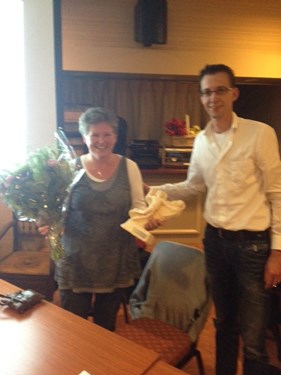 Intussen was het al behoorlijk laat geworden door alle discussies en er stond nog een belangrijke gebeurtenis op de agenda n.l het benoemen van Helma Nannes als erelid. Zij heeft na 24 jaar afscheid genomen van de Jeugdcommissie waarin zij vele taken heeft vervuld, de laatste jaren als secretaris. Zij ontving uit handen van de voorzitter een prachtig boeket en het traditionele ”volleybalbeeld” dat bij het erelidmaatschap hoort.