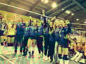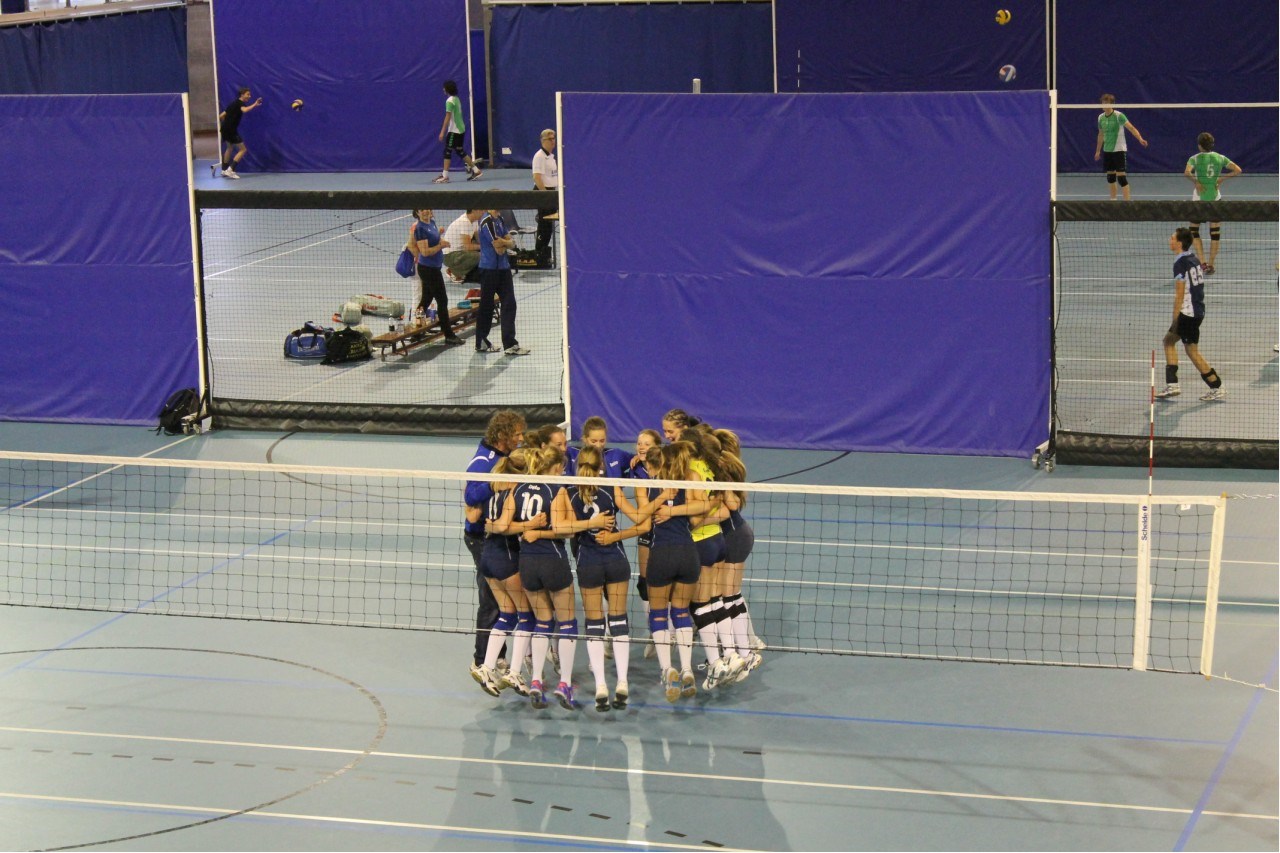 Dat is om 16.30 uur tegen Impala. Betekent niet dat de 2-0 in de eerste wedstrijd zondermeer weer behaald wordt. Het tegendeel lijkt. Na een matige start en een achterstand van 14-18 hervat de selectie zich volledig en komt met goede passings, scherpe services en opbouwende aanvallen terug in de wedstrijd. Moeizaam nog weliswaar. Maar het geloof bij de speelsters is er. Op 24-24 wordt er vanaf de tribune heel brutaal door een aantal Dinto supporters “1, 1,1” gescandeerd, alhoewel zij heel goed weten dat het er nog minimaal 2 moeten zijn. Met Amber aan service, Lieke in passing en Renske op de aanval, wordt er met 26-24 gewonnen.