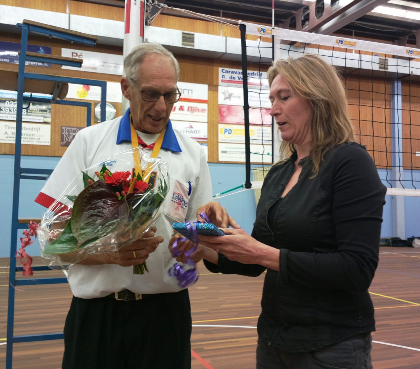 Zaterdag 14 maart was een speciale dag voor Otto Seegers, hij nam met de wedstrijd De Nijs/Dinto H1 tegen Clam Dycke afscheid van de scheidsrechterstoel bij Dinto. Otto heeft zich vele jaren ingezet voor de club o.a. met geven van de scheidsrechtercursus VS2 voor de leden. Na afloop van de wedstrijd werd hij door Martina in het zonnetje gezet en kreeg hij van Peter Tuin de Nevobospeld uitgereikt.