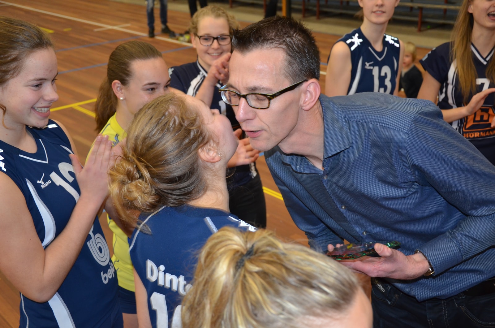Hierna werd bij terugkeer in Warmenhuizen de groep gehuldigd en werd door Niels Goudsblom de medailles, een troffee en wat lekkers uitgereikt. De trotse coach Erik werd in de bloemen gezet en ook de drie speelsters die vanuit de B2 af en toe hebben moeten invallen en dit zeer verdienstelijk hebben gedaan werden erbij gehaald.