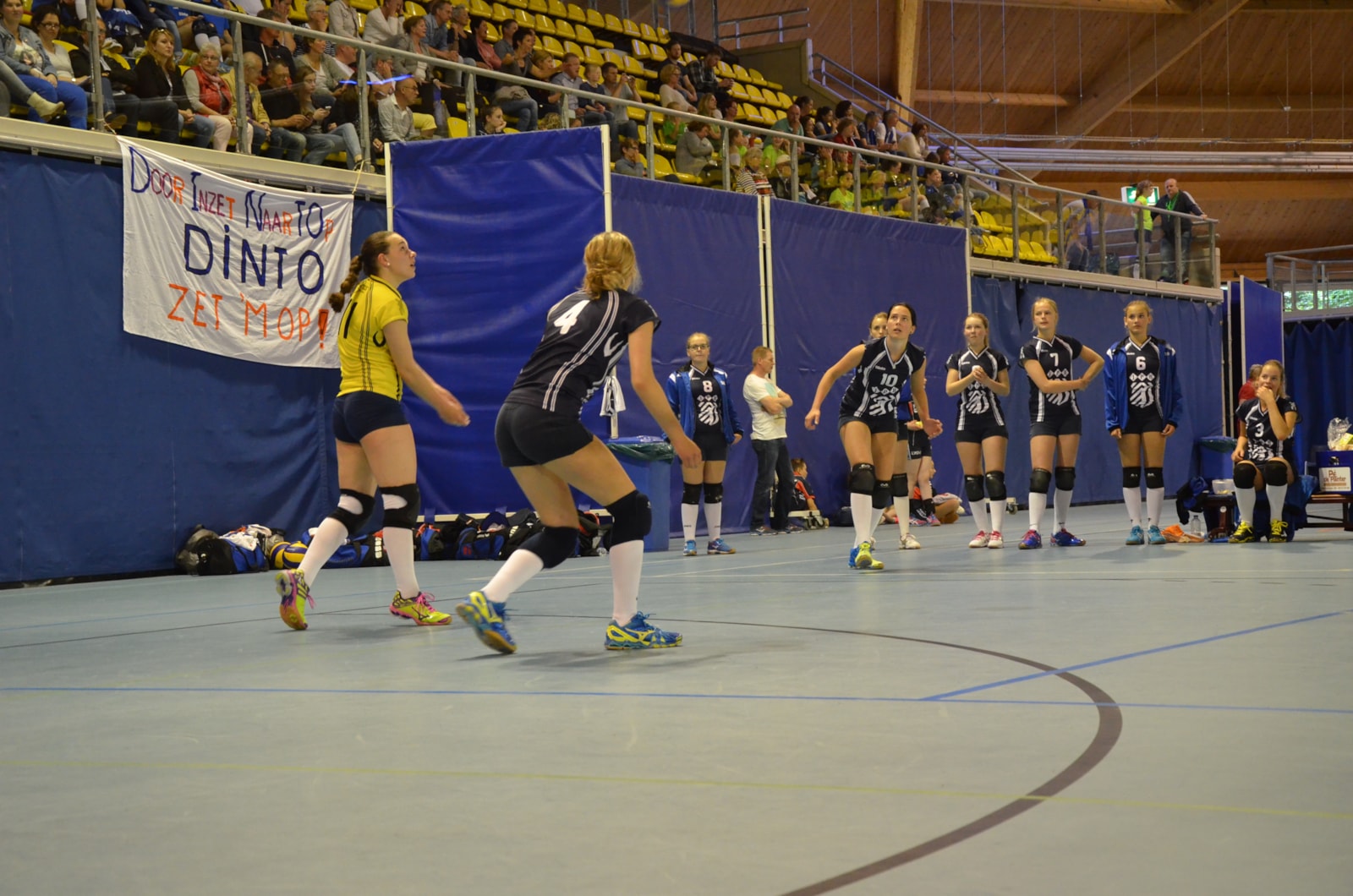 Het geluid werd steeds minder toen onze meiden een fantastische start maakte in deze wedstrijd. We waren als Dinto supporter bijna geneigd om het supporters vak van Rivo toe te zingen met “het is stil aan de overkant … ”, want Dinto won met 25-17 de eerste set. Echter in de tweede set waren de rollen precies omgedraaid en won Rivo met 25-13.