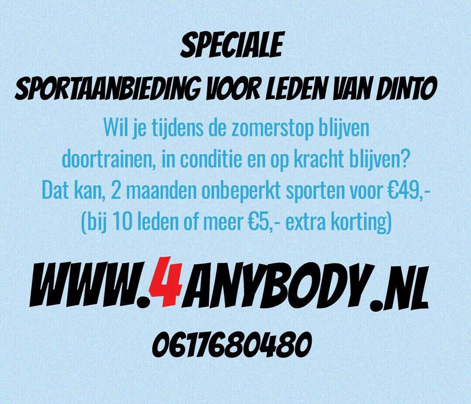 4Anybody heeft speciaal voor al onze dintoleden een mooie zomeraanbieding om lekker fit te blijven. Dames 1 is inmiddels een uurtje flink bezig geweest o.l.v. Nancy. De meiden waren erg enthousiast.