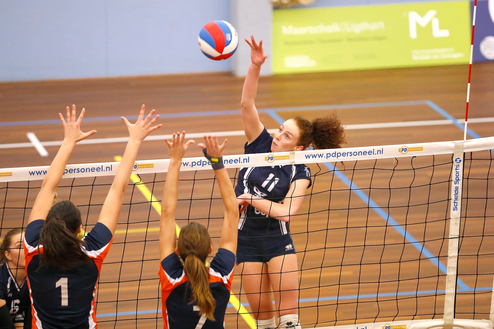 Warmenhuizen - Door een overwinning op Forza Hoogland hebben de volleybalsters van Bejo/Dinto goede zaken gedaan voor het klassement. De ploeg wist na een 0-1 achterstand in sets het duel volledig naar de hand te zetten en zegevierde met 3-1.Om de aansluiting met Vives en Keistad te behouden was het zaak voor de thuisploeg om zo min mogelijk punten te morsen. Dinto miste echter belangrijke speelsters. Misha Nannes was op de training geblesseerd geraakt. Indra Top was afwezig en Cindy Pronk ziek en daardoor beperkt inzetbaar. Forza Hoogland heeft elk punt keihard nodig om weg te blijven van de onderste regionen en de Amersfoortsen begonnen derhalve met een grote selectie en het mes tussen de tanden aan het belangrijke duel. Dinto was in de eerste set wisselvallig. Aanvallend was het met Renske Meijer door het centrum, Linda Schipper en Sammie Poel op de buitenkant en Lynn Delver op de diagonaal dik in orde, maar vooral de passing was aanvankelijk ondermaats. Ook de service, normaal gesproken een gevaarlijk wapen, ging veel fout en de defensief uitstekend spelende bezoeksters konden, met veel risicovolle smashes, brutaal een 18-20 voorsprong nemen. Door een goede aanval van Lynn Delver en strakke opslagen van Linda Schipper kon Dinto aanhaken. De passing liet de thuisploeg echter in de slotfase in de steek. Door een service van Forza, die kort over de netrand rolde, werd de setwinst de Amersfoortsen in de schoot geworpen:23-25. Dinto raakte evenwel niet in paniek. De passing kwam beter bij Amber Jongejan aan en Cindy Pronk liet zich gelden aan het net. De foutenlast bij Forza ging geleidelijk omhoog. Bij een 21-15 stand kwam Jente Schrieken voor de dubbele wissel binnen de lijnen. In deze opstelling werd de set eenvoudig afgemaakt:25-18. Dinto kwam steeds beter op stoom.De passing van Pernilla Boersen was honderd procent. Cindy Pronk en Sammie Poel scoorden eenvoudig over de blokkering. Luka Peters zette met haar sprongfloateropslag een enorme druk op de servicereceptie. De aanvankelijk zo enthousiast spelende bezoeksters toonden steeds minder vertrouwen in eigen kunnen. De coach van Forza probeerde met diverse wissels en time-outs het tij te keren, maar de side-out was slordig en de blokkering kon het snelle tempo in de aanval niet bijbenen. Met 25-14 kwam Dinto op een 2-1 voorsprong. De thuisploeg gooide vervolgens alle remmen los. Amber Jongejan bracht Luka Peters en Renske Meijer veelvuldig in stelling. Linda Schipper was goed voor veel servicepunten en met een voor de derde divisie uitzonderlijke setstand (25-6) werd het treffen fraai afgesloten. Volgende week wacht Dinto de lastige uitwedstrijd bij Madjoe. Het team uit Enkhuizen behoort tot de drie ploegen die dit seizoen Dinto wist te verslaan.