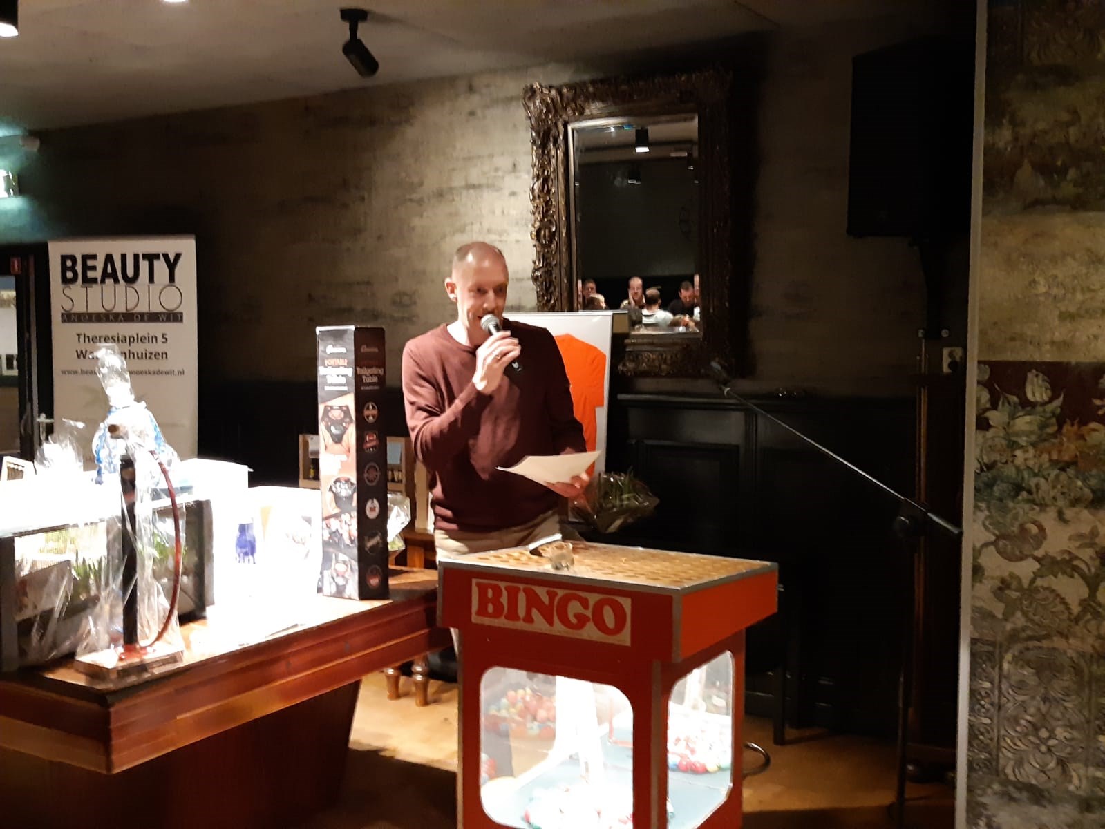 Nadat iedereen bij Peter en Anton zijn bingokaarten had gekocht en een plek had gevonden in de goed gevulde zaal was er eerst een verloting met 10 kleinere prijsjes waarna Bingomaster Joost zijn uitleg begon hoe zo’n Bingo nou eigenlijk werkt. Gesteund door Jos van Baar, “de conducteur” op deze avond en Martien Komen, “de pakketbezorger” was het hele stel compleet. Het was zelfs zo dat onze man van de verloting bij de thuiswedstrijden, Jan, ook nog mee ging bingoën!