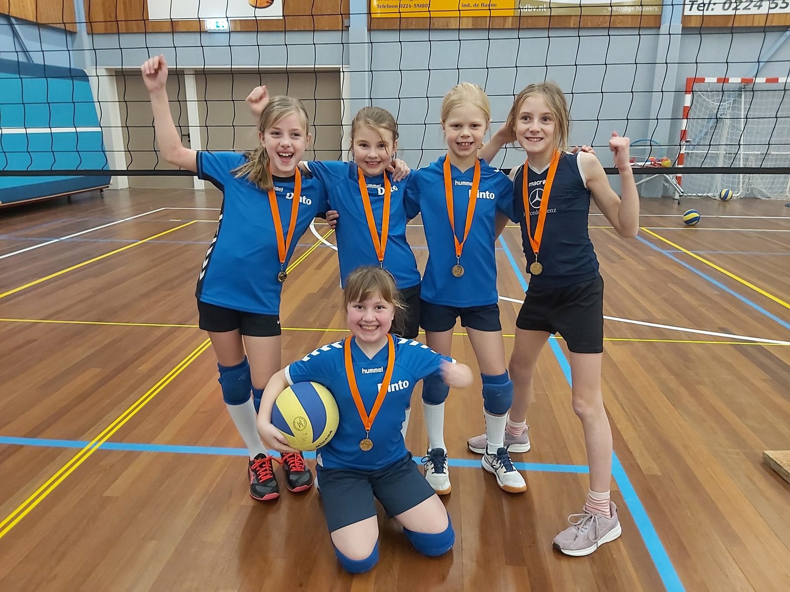 Nadat de meiden aan het eind van de eerste helft kampioen zijn geworden bij niveau 3, hebben ze eindelijk de medailles gekregen. Trots staan zij op de foto en hopen in de tweede helft ook hoge ogen te gooien.