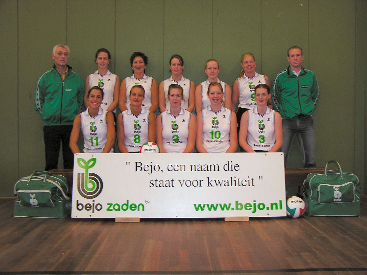 In de top van de volleybalwereld zijn opmerkelijke wijzigingen binnen de teams meer regel dan uitzondering. Toch is de selectie van Dinto sinds jaar en dag vrij constant. Dit seizoen was er echter voor het Warmenhuizer vlaggenschip geen ontkomen aan. Inge Ligthart, Simone van Haneghem en Marjon Twijnstra moeten door zwangerschap een jaartje verstek laten gaan. Josien Oud verhuisde naar Amsterdam. Saskia van Daalen zocht haar heil in de eerste divisie bij Simokos. Een vrijwel volledig basisteam was derhalve verdwenen. Trainer Johan Veltman zag het vervolgens niet meer zitten en stopte abrupt. De vereniging toonde veerkracht en wist met eigen jeugd en teruggekeerde speelsters een team op de been te brengen. Voorzitter Bobbes de Ruyter kon bovendien snel een nieuw trainersduo presenteren. Dennis Vlietstra kwam over van Madjoe uit Enkhuizen en nam als assistent Han Ruiterkamp mee. De kersverse trainer liet zich snel bijpraten over de selectie en kon vrijwel direct met de voorbereiding beginnen. “ Ik trof een enthousiaste groep meiden aan, die bereid waren voor elkaar te werken”, aldus Vlietstra. “ Er was nog weinig routine over. Van het team dat vijfde was geworden in de tweede divisie waren alleen Esther Smit, Mireille de Goey en Elles Kraakman over.” Het team kon aangevuld worden met Jorinde Olling en Leonie Schipper uit de eigen jeugd. Voormalige eerste teamspeelsters Astrid van Straten, Els Stoop, Davina Olling en Channa Bak kwamen terug. Bovendien promoveerde Linda van Dijk vanuit het tweede team. Noodgedwongen speelde Bejo/Dinto de laatste twee seizoenen met één spelverdeelster. Aan deze kwetsbare positie kwam verrassend genoeg ook een eind. Geertje de Groot, een aantal jaren speelster bij de eigen Dinto-jeugd, kwam weer in de buurt wonen en meldde zich bij Dinto aan. Vlietstra is zeer over haar te spreken. “Ik vind het opmerkelijk, dat zij spelend vanuit een eerste klasse zo snel de stap naar divisieniveau heeft weten te maken.”Maar ook de rest van het team lijkt snel haar draai gevonden te hebben. “We hebben natuurlijk een aantal meiden, die opeens vele klassen hoger en dus beter moeten spelen. De teamspirit en sfeer zijn zo goed, dat er direct flinke sprongen gemaakt worden.” Dit bleek al in de voorbereiding, waarin er nipt van eerste divisieploegen verloren werd. Regiodivisionist Croonenburg was met 4-1 een maatje te klein. Toch blijft de doelstelling simpel volgens Vlietstra. “We proberen voornamelijk het eigen spelpeil te verhogen en dan zien we wel waar we uitkomen. Bovendien staat natuurlijk het spelplezier voorop, want we zullen het superzwaar krijgen in deze ijzersterke competitie.”