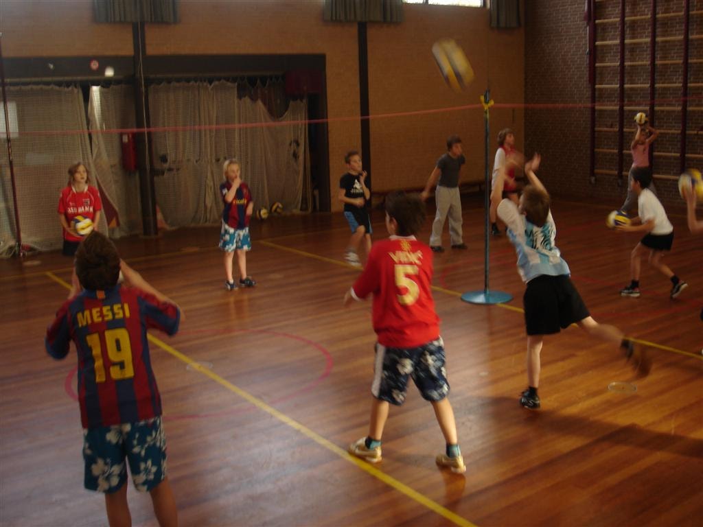 Het toernooi wordt op niveau 2 gespeeld dus we hebben ze geleerd: onderhands serveren, onderhands vangen, bovenhands gooien.