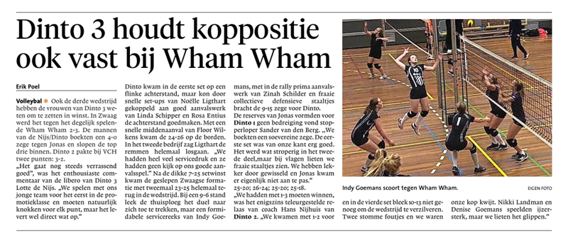 Driemaal DintoWarmenhuizen - Na het enorme echec van vorige week bij Ardea hebben de volleyballers van De Nijs/Dinto vol uitgehaald tegen hekkensluiter VCH en bezetten nu de vierde plaats:4-0. Dinto DS3 na overwinning op MOVE naar volgende bekerrondeWarmenhuizen: Een stevige 3-0 overwinning op de hoofdmacht van het Volendammer Move heeft de volleybalsters van Dinto gebracht tot de volgende ronde van de bekercompetitie.